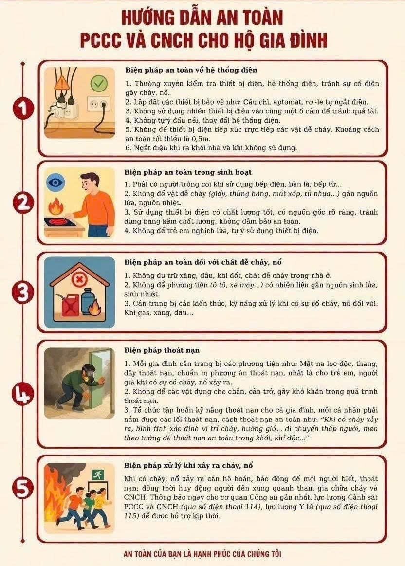 Để chủ động phòng ngừa, hạn chế thấp nhất thiệt hại do cháy, nổ gây ra, mỗi cơ quan, đơn vị và người dân trên địa bàn xã Chư Pưh cần nâng cao ý thức và thực hiện tốt các biện pháp sau: Trước hết, cần đặc biệt chú ý đến an toàn hệ thống điện. Thường xuyên kiểm tra, bảo dưỡng hệ thống điện, dây dẫn, thiết bị điện trong gia đình và nơi làm việc; kịp thời thay thế các thiết bị đã cũ, hư hỏng. Không sử dụng nhiều thiết bị điện cùng lúc trên một ổ cắm để tránh quá tải gây chập cháy. Khi ra khỏi nhà hoặc không sử dụng, cần tắt các thiết bị điện không cần thiết. Trong sinh hoạt hằng ngày, cần quản lý chặt chẽ các nguồn lửa, nguồn nhiệt. Không để các vật liệu dễ cháy như giấy, nhựa, xăng dầu… gần bếp đun, bàn là hoặc các thiết bị sinh nhiệt. Khi sử dụng bếp gas, bếp điện phải có người trông coi; sau khi sử dụng phải khóa van gas và tắt nguồn điện cẩn thận. Đặc biệt, không để trẻ em nghịch lửa, thiết bị điện. Đối với các chất dễ cháy, nổ, người dân không nên dự trữ xăng, dầu, khí gas với số lượng lớn trong nhà. Nếu cần thiết phải bảo quản đúng quy định, để xa nguồn nhiệt và nơi có nguy cơ phát sinh tia lửa. Các phương tiện có chứa nhiên liệu cũng cần được để ở nơi thông thoáng, tránh ánh nắng trực tiếp. Bên cạnh đó, mỗi gia đình cần chuẩn bị sẵn sàng phương án thoát nạn khi xảy ra cháy. Nhà ở nên có ít nhất hai lối thoát hiểm; không để vật cản che chắn lối đi, cầu thang, cửa thoát hiểm. Trang bị các phương tiện cần thiết như bình chữa cháy xách tay, mặt nạ phòng độc, đèn pin… và thường xuyên tập huấn kỹ năng thoát nạn cho các thành viên trong gia đình. Khi không may xảy ra cháy, nổ, cần bình tĩnh xử lý, nhanh chóng hô hoán để mọi người xung quanh biết, đồng thời cắt điện khu vực cháy nếu có thể. Sử dụng các phương tiện chữa cháy tại chỗ để dập lửa ban đầu và nhanh chóng thoát ra khu vực an toàn. Ngay lập tức báo cho lực lượng Cảnh sát PCCC qua số điện thoại 114 để được hỗ trợ kịp thời.