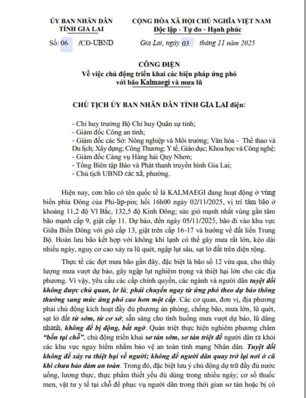 CÔNG ĐIỆN Về việc chủ động triển khai các biện pháp ứng phó với bão Kalmaegi và mưa lũ Ngày đăng: 03/11/2025 2 lượt xem Danh sách file (4 files) Tải về z7183606949320_f5d4ddd2ea98d79cd681a5616a862ad8_d9ffa.jpg Tải về z7183606934512_f1e06d007512e81e883d8f4148d44704_2acbe.jpg Tải về z7183606945793_0051cff46c72c10041941b2b43839cf4_af8a0.jpg Tải về z7183606929254_f1298b6a7797afb46d12c1a43d29c8fc_318c6.jpg