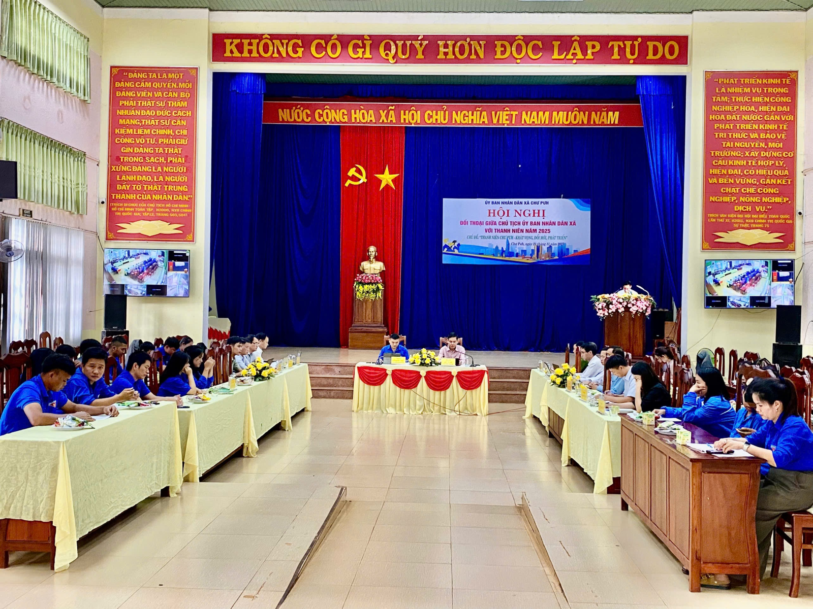 Chiều ngày 21/11/2025, tại Hội trường 10/12, UBND xã Chư Pưh đã tổ chức Hội nghị đối thoại giữa Chủ tịch UBND xã Siu Y Bé với thanh niên năm 2025 với chủ đề “Thanh niên Chư Pưh-Khát vọng, đổi mới, phát triển”. Đồng chủ trì hội nghị còn có đồng chí Lữ Quốc Việt-Phó Chủ tịch UBMTTQVN xã, Bí thư đoàn xã. Tham dự hội nghị đối thoại còn có các đồng chí Trần Đình Thi-Phó Bí thư Thường trực Đảng uỷ; Nguyễn Văn Hạ-UVBTVĐU, Phó Chủ tịch HĐND xã; Đại diện lãnh đạo UBMTTQ Việt Nam và các đoàn thể xã; Lãnh đạo các đơn vị: Công an xã, Ban Chỉ huy quân sự xã, Phòng Kinh tế, Phòng Văn hoá-Xã hội, Trung tâm Phục vụ hành chính công, Văn phòng HĐND&UBND xã, Ban quản lý Chư Pưh, Trung tâm VHTT&TT xã; Trạm y tế xã, Ngân hàng Chính sách Xã hội Chư Pưh, Bảo hiểm cơ sở Chư Sê.