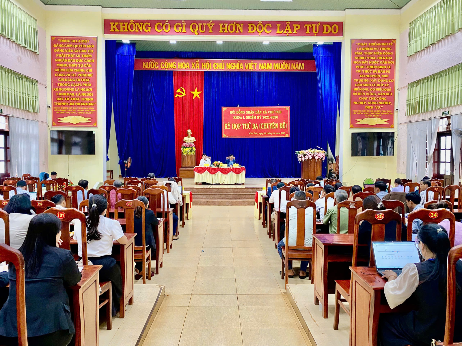 Sáng ngày 16/10/2025, tại hội trường 10/12, Hội đồng nhân dân xã Chư Pưh đã tổ chức Kỳ họp thứ Ba (chuyên đề) khóa I, nhiệm kỳ 2021-2026 để xem xét, thảo luận và thông qua một số nội dung quan trọng. Tham dự kỳ họp còn có các đồng chí: Trần Đình Thi-Phó Bí thư Thường trực Đảng uỷ xã; Siu Y Bé-Phó Bí thư Đảng uỷ, Chủ tịch UBND xã; Ksor H’ Huen-UVBTVĐU, Chủ tịch UBMTTQ xã; lãnh đạo UBND xã; lãnh đạo các phòng, ban chuyên môn cùng các đại biểu HĐND xã. Các đồng chí: Nguyễn Huy Châu-Bí thư Đảng uỷ xã, Chủ tịch HĐND xã; Nguyễn Văn Hạ-UVBTVĐU, Phó Chủ tịch HĐND xã đồng chủ toạ kỳ họp.
