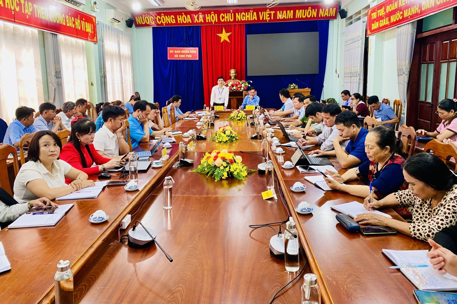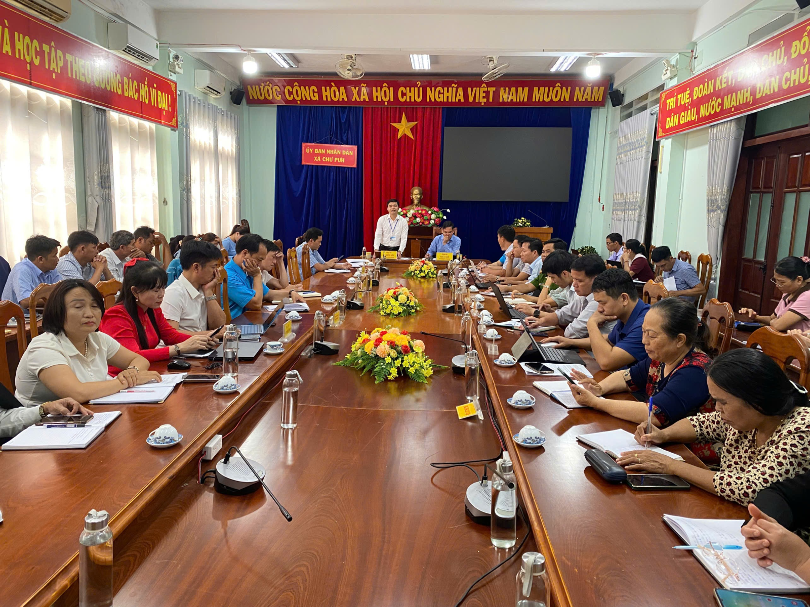 Chiều ngày 15/10/2025, tại phòng họp A, Ủy ban nhân dân xã Chư Pưh tổ chức cuộc họp Ban chỉ đạo thực hiện chính sách Bảo hiểm xã hội, Bảo hiểm Y tế nhằm đánh giá tiến độ triển khai thực hiện chính sách bảo hiểm trên địa bàn xã trong thời gian qua và bàn giải pháp thực hiện nhiệm vụ thời gian tới. Tham dự có các thành viên Ban chỉ đạo thực hiện chính sách Bảo hiểm xã hội, Bảo hiểm y tế theo Quyết định số 332/QĐ-UBND ngày 29/8/2025 của UBND xã Chư Pưh; lãnh đạo Phòng Văn hóa – Xã hội; Phòng Kinh tế; đại diện Bảo hiểm xã hội cơ sở Chư Pưh; Trung tâm Y tế Chư Pưh. Đồng chí Siu Y Bé - Phó Bí thư Đảng ủy, Chủ tịch UBND xã, Trưởng Ban chỉ đạo và đồng chí Lê Đình Sơn – UVBTVĐU, Phó Chủ tịch UBND xã đồng chủ trì cuộc họp.