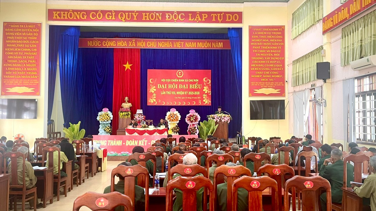 Chiều ngày 22/10/2025, tại hội trường 10/12, Hội Cựu chiến binh xã Chư Pưh long trọng tổ chức Đại hội Đại biểu Hội CCB xã lần thứ VIII, nhiệm kỳ 2025–2030. Tham dự Đại hội có đồng chí Trần Đình Thi – Phó Bí thư Thường trực Đảng ủy xã; Nguyễn Văn Hạ - UVBTVĐU, Phó Chủ tịch HĐND xã; Lê Đình Sơn-UVBTVĐU, Phó Chủ tịch UBND xã; Ksor H’ Huen-UVBTVĐU, Chủ tịch UMTTQTVN xã, các đồng chí nguyên Chủ tịch Hội CCB xã qua các thời kỳ; đại diện lãnh đạo các phòng, ban đơn vị và các ban, ngành, đoàn thể xã, cùng 66 đại biểu chính thức đại diện cho 321 hội viên Hội CCB trong toàn xã.