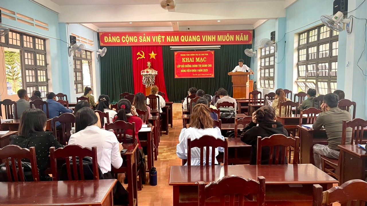 Sáng ngày 21/10/2025, Trung tâm Chính trị xã Chư Pưh đã tổ chức khai giảng lớp bồi dưỡng lý luận chính trị dành cho đảng viên mới khóa I, năm 2025 cho 31 học viên là đảng viên mới kết nạp ở các tổ chức cơ sở Đảng trên địa bàn 3 xã Chư Pưh, Ia Le và Ia Hrú.